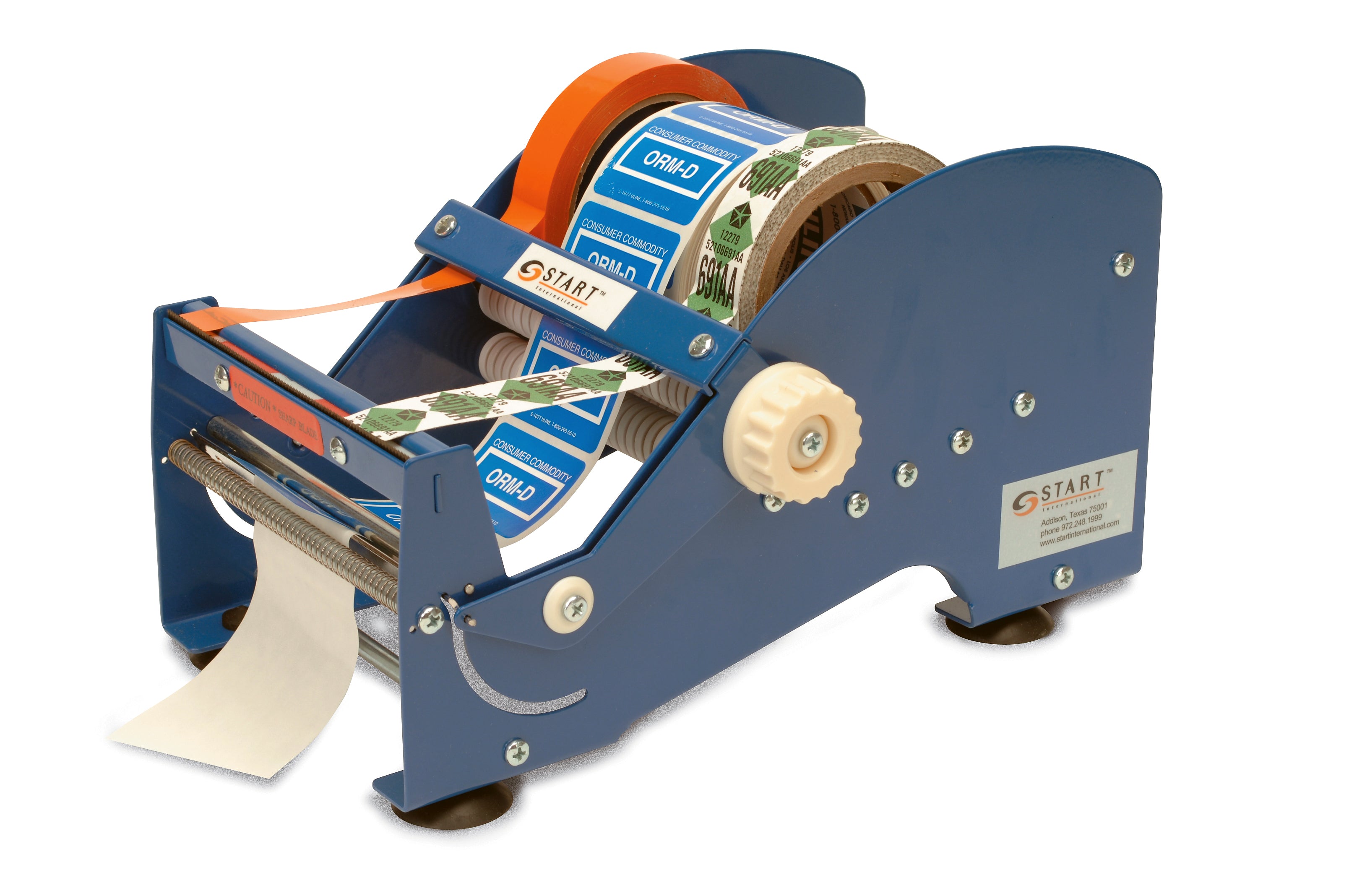 The SL9506 is a manual multi-use dispenser that peels labels and cuts tape from multiple rolls. The dividers adjust to separate different sized rolls. Each roll can be changed individually and it will accept any sized roll core holder.