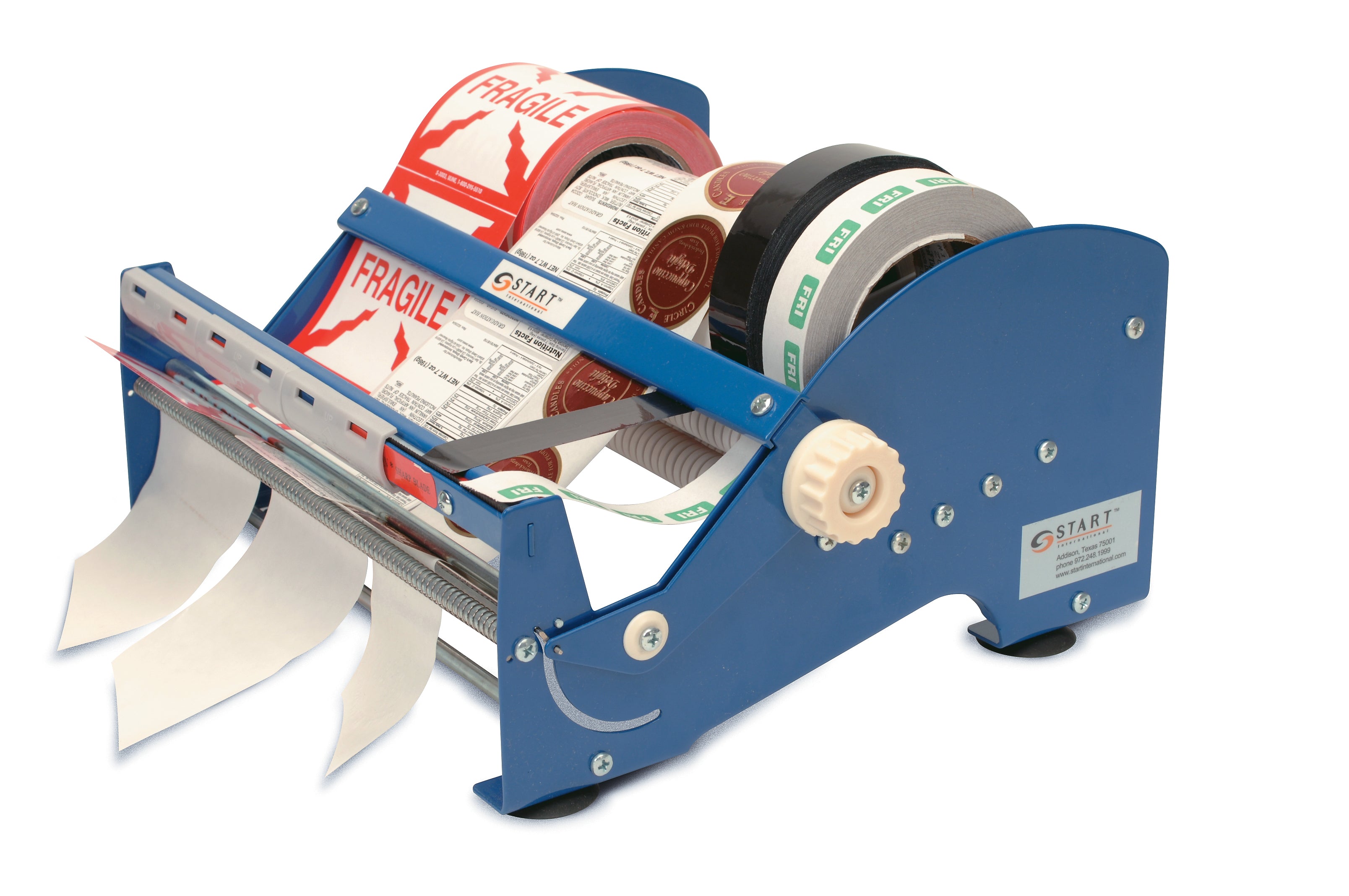 The SL9512 is a manual multi-use dispenser that peels labels and cuts tape from multiple rolls. The dividers adjust to separate different sized rolls. Each roll can be changed individually and it will accept any sized roll core holder.