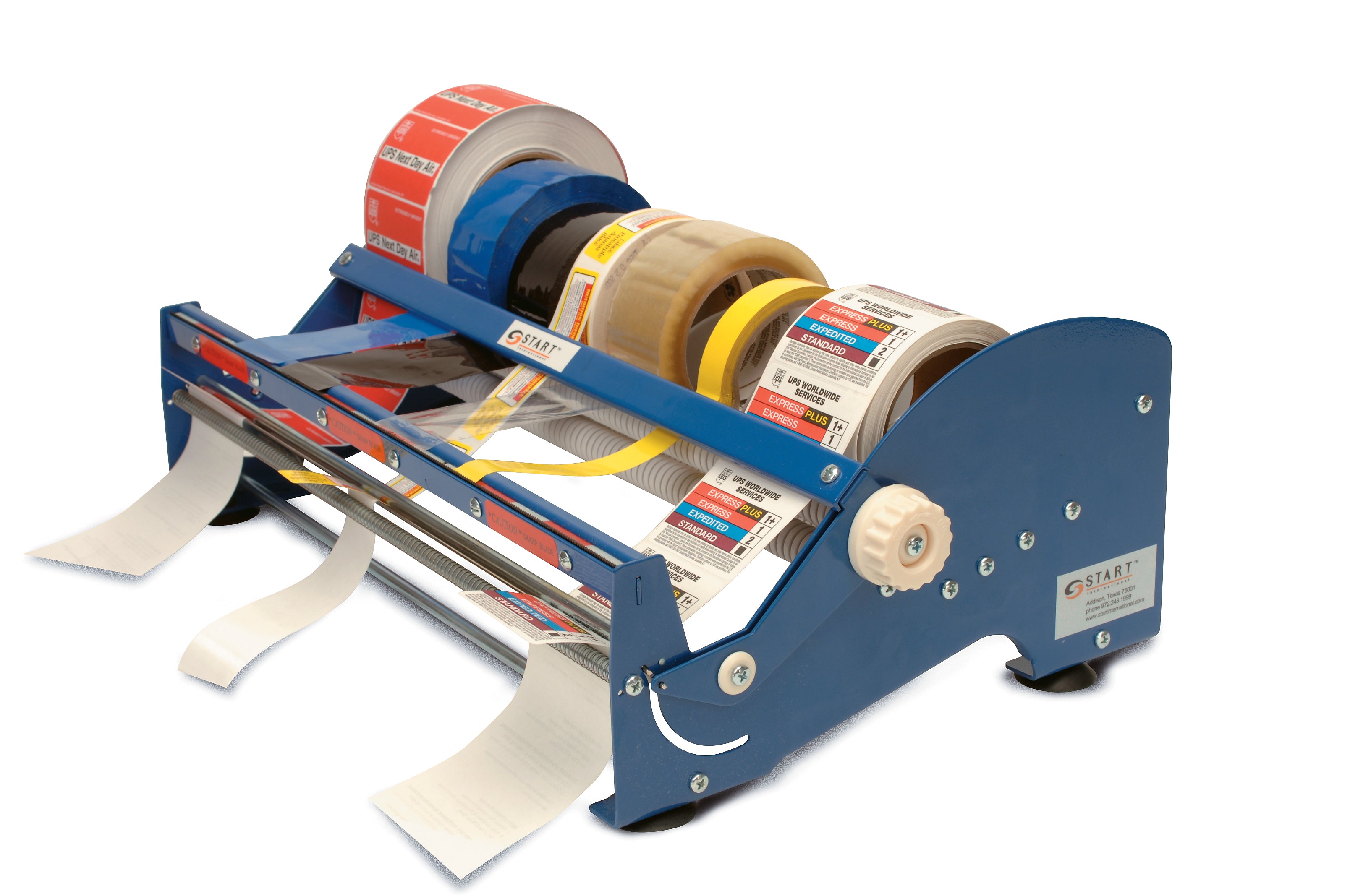 The SL9518 is a manual multi-use dispenser that peels labels and cuts tape from multiple rolls. The dividers adjust to separate different sized rolls. Each roll can be changed individually and it will accept any sized roll core holder.
